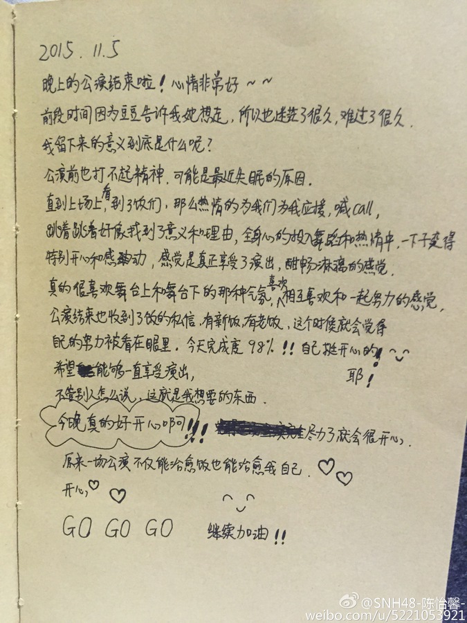 离首演的日子只剩下一个多月,每天学公演曲,记站位,练习舞蹈 一天天都觉得过得很快 很充实,不知道真的那天来了 站在剧场舞台上跳自己的公演曲听着台下为我们喊的call又会是怎样的心情。不想搞砸(>_<)(>_<)(>_<)谢谢一直在我身边鼓励我的朋友 家人 还有你们。加了个油~!